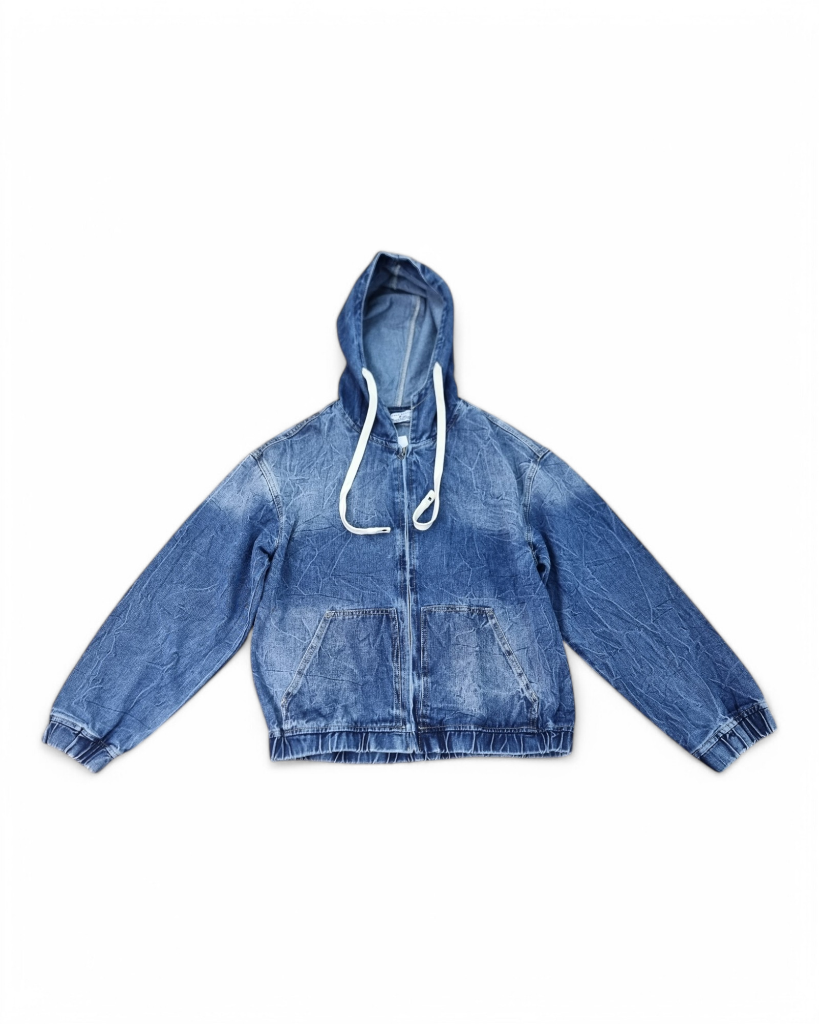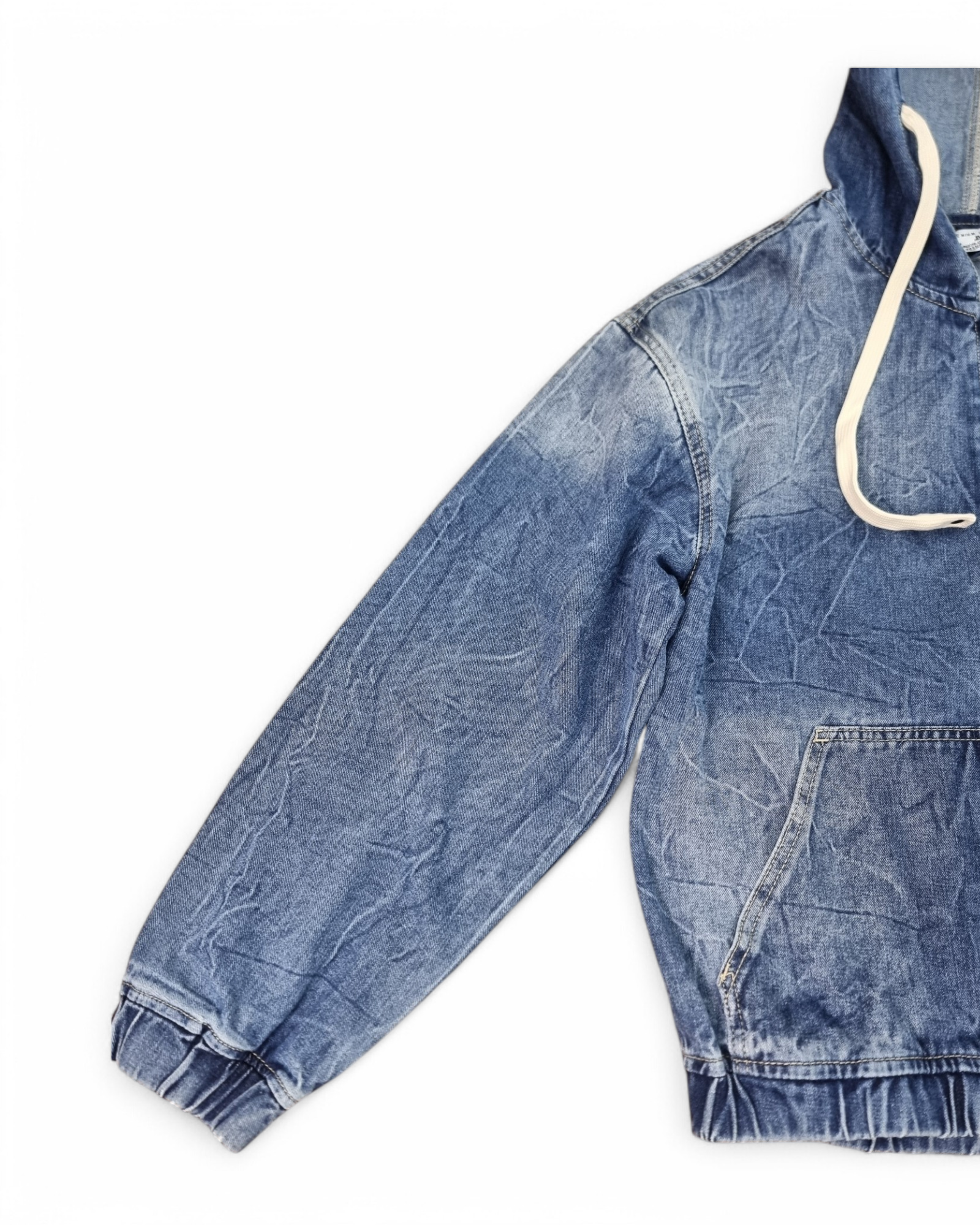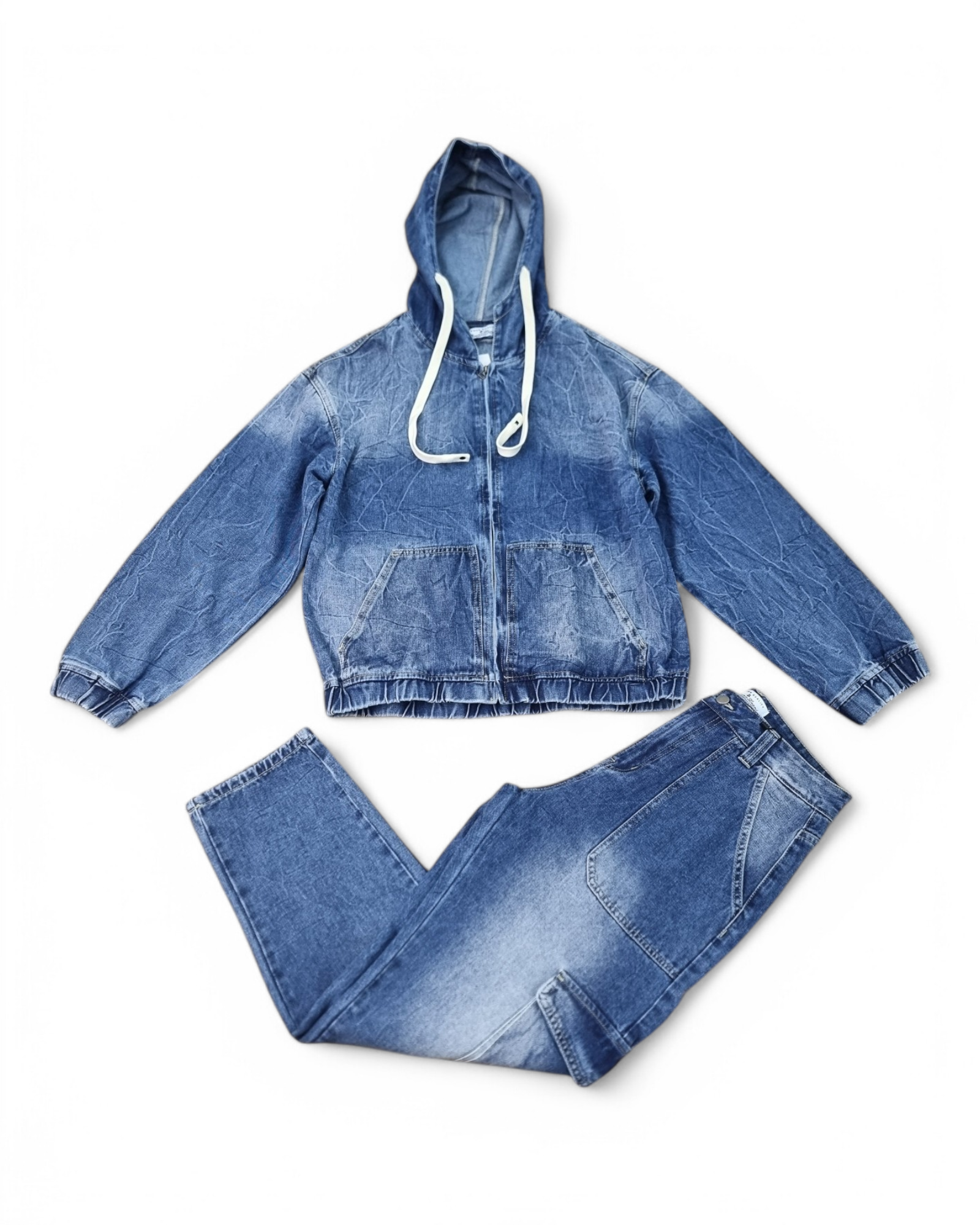 Completo con giubbino con zip e cappuccio e pantalone cargo in denim